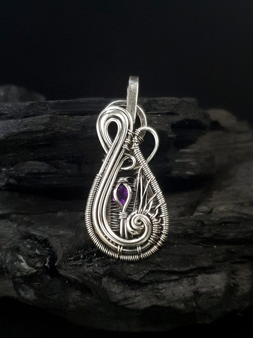 Ce pendentif unique est élaboré à partir de fils d’argent sterling sertissant une Améthyste facettée de 4mm.