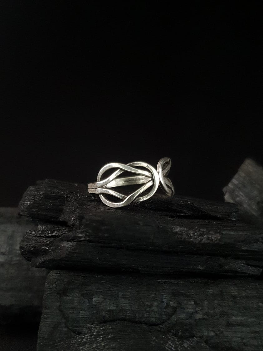 Cette bague artisanale en fils d’argent tressés est inspirée d’un modèle celtique traditionnel, le Nœud Éternel.