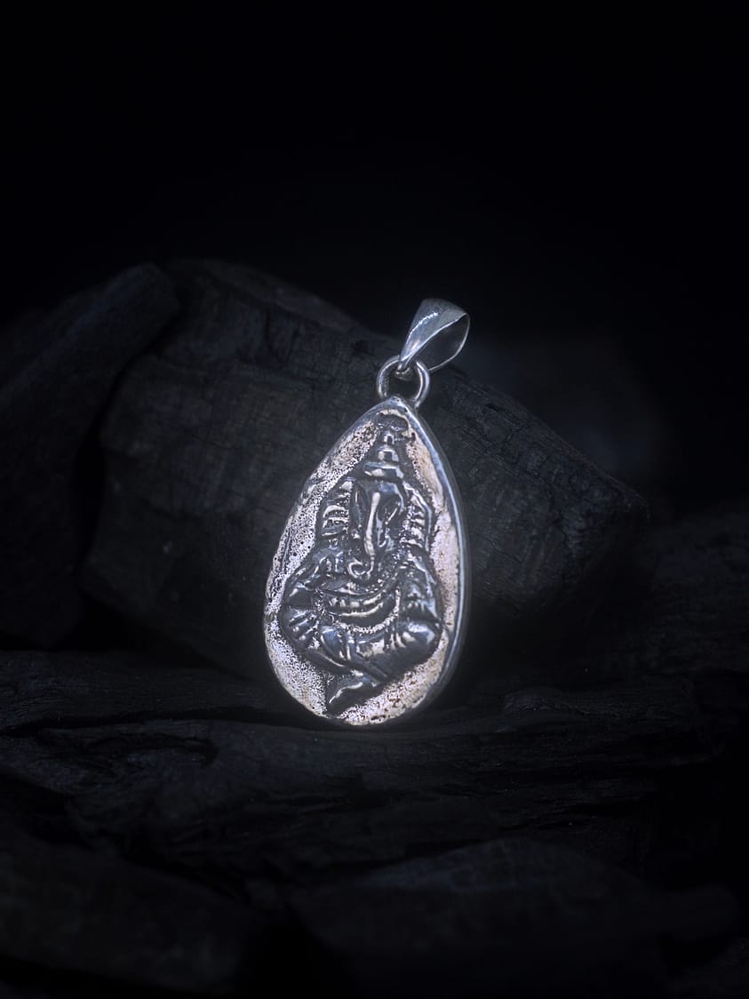Ce magnifique pendentif élaboré à partir d’argent coulé (fonte en sable) représente la divinité hindouiste Ganesh.